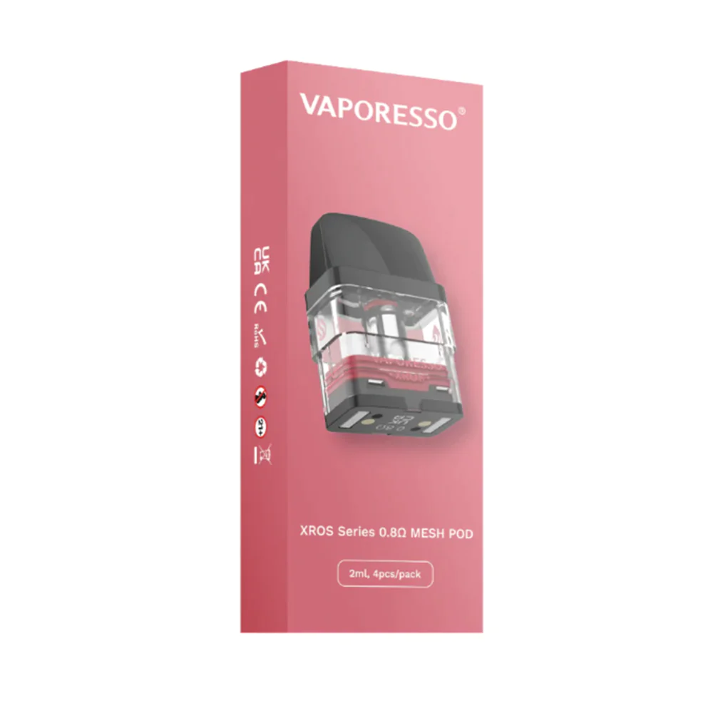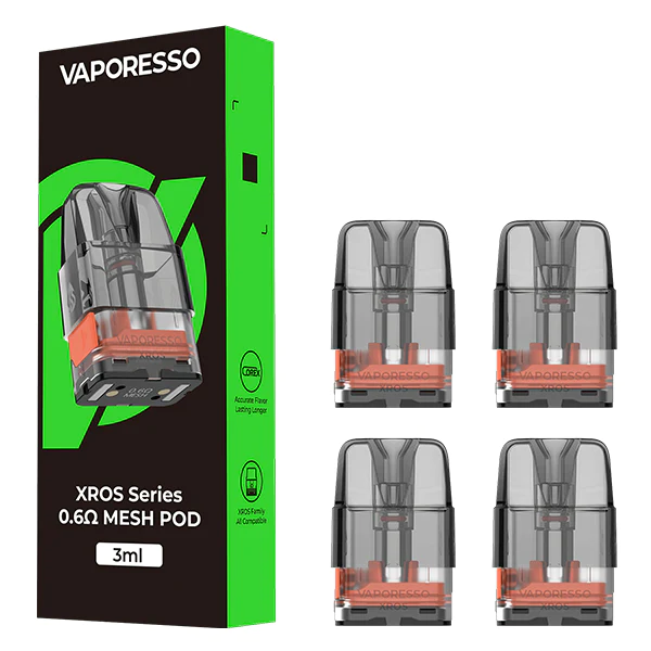 Discover the Vaporesso XROS Pods (4-PACK), featuring refillable pods, a reliable fill system, and utilizes a mesh coil heating structure. Constructed with a transparent juice viewing window, the XROS replacement pods allow for the user to check juice levels without removing the pod. Equipped with an integrated mesh coil, the XROS pods consist of a 0.8ohm and 1.2ohm mesh coil pod, holding a sizeable amount of eJuice refilled via silicone stoppered fill system. At the base is a magnetic pod connection, allowing quick and easy coil replacements while securing the pods.